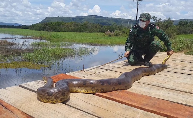 “Wir haben die Anakonda in einem ländlichen Gebiet in der Nähe von Buritis eingesammelt. Es befand sich in der Nähe eines Wohnhauses, und der Bewohner rief uns an und bat um Hilfe”, sagte der Leutnant Marcos Paulo Dias Oliveira.